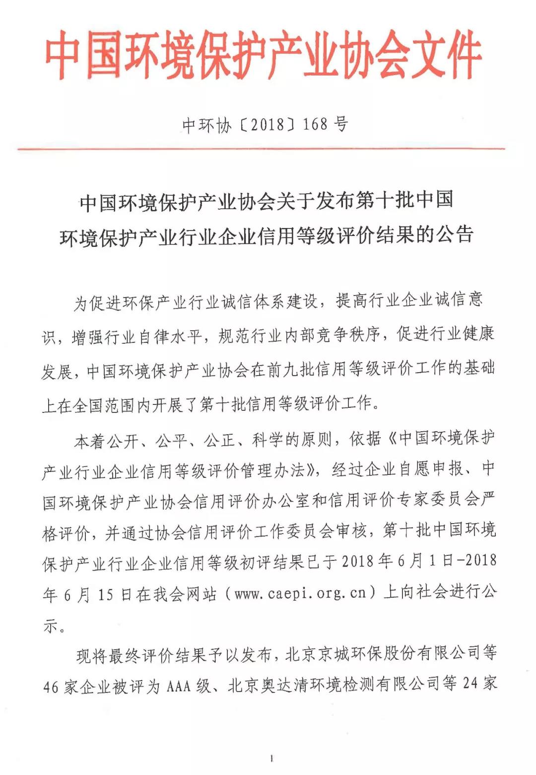 久科環(huán)保獲中國(guó)環(huán)境保護(hù)產(chǎn)業(yè)協(xié)會(huì)企業(yè)信用等級(jí)評(píng)價(jià)AAA評(píng)級(jí)
