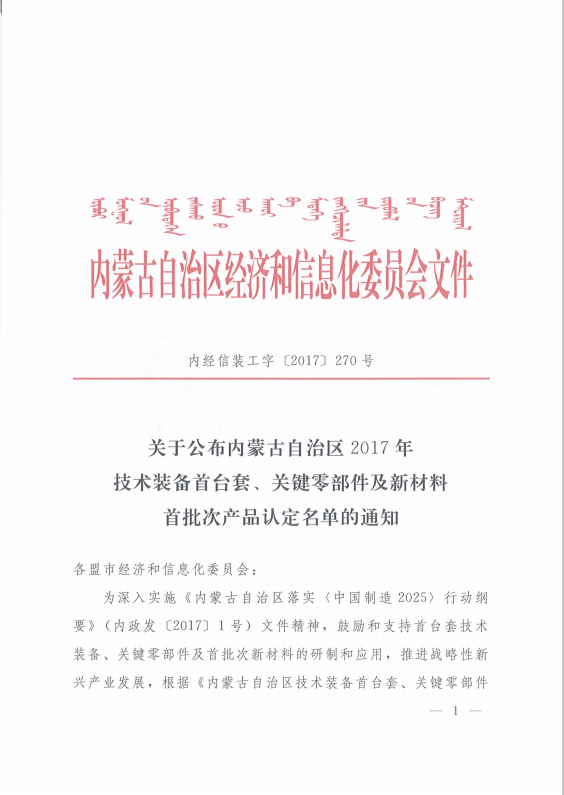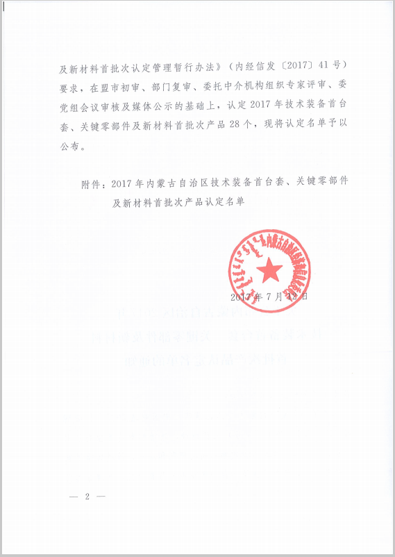 2017年7月12日,內蒙古自治區經濟和信息化委員會公布了內蒙古自治區2017年技術裝備首臺套、關鍵零部件及新材料首批次產品認定名單,久科環保的煤化工高含鹽難降解有機廢水處理與分質鹽資源化設備成功入圍。