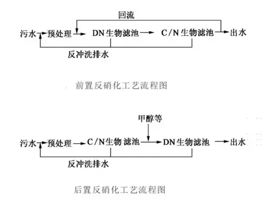 2反硝化對(duì)于需要脫N的污水,曝氣生物濾池的反硝化通常有前置反硝化和后置反硝化兩種。前置反硝化的前提是滿足系統(tǒng)反硝化的碳源要求,廢水首先經(jīng)過(guò)DN濾池或?yàn)V池的DN段(把反硝化和硝化組合在1個(gè)濾池中,通過(guò)對(duì)不同濾料中的組合達(dá)到硝化和反硝化的目的)。